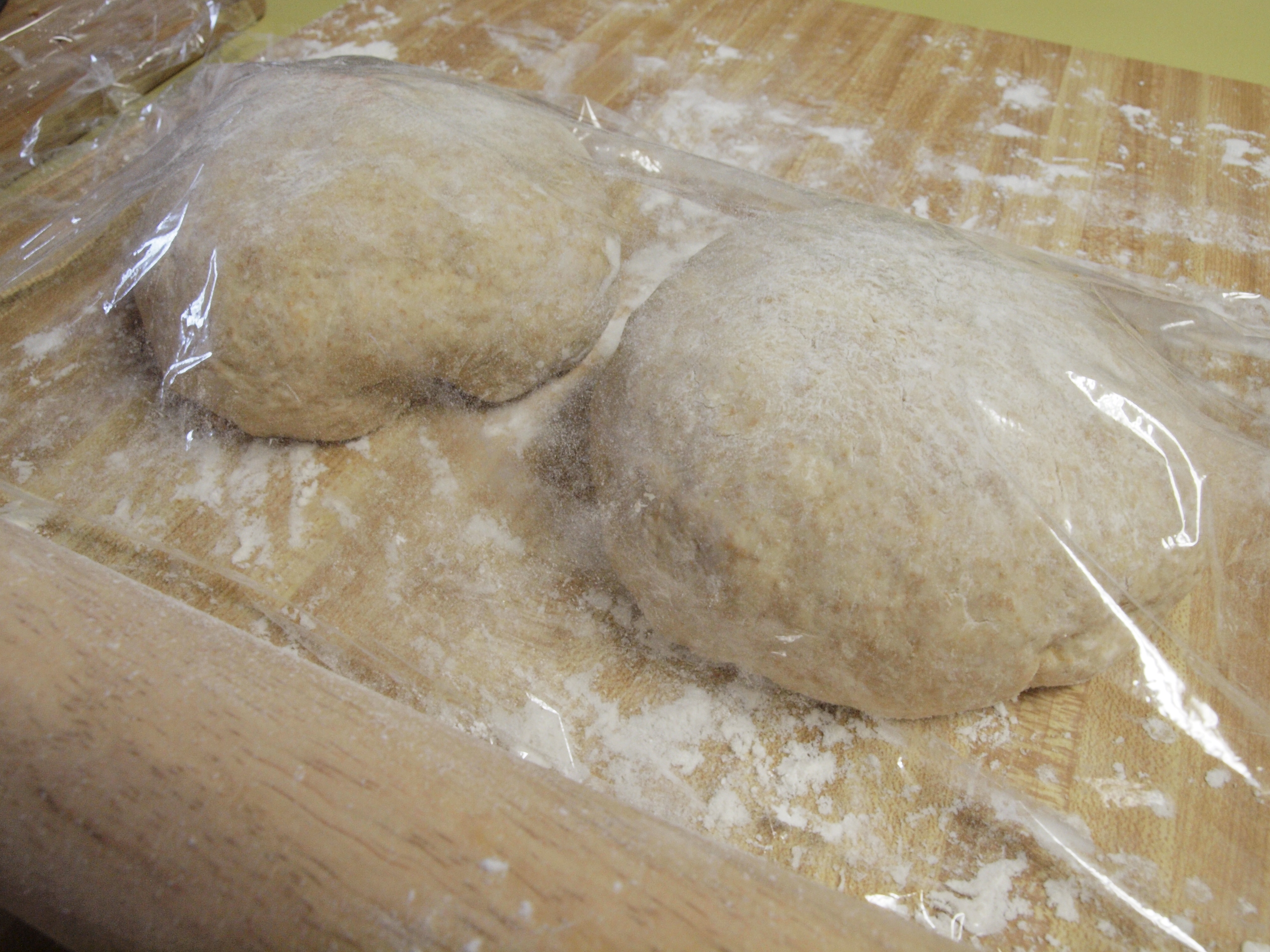 2. Take the dough out of the bowl and put onto a well floured board. Divide the dough in half. Knead each piece of dough a few times on the floured surface until less sticky but still tacky. Cover the dough with plastic wrap and let rest for 10 minutes.