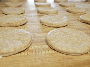 3. On a well floured surface, roll each half of the dough into a thin circle, 1/4-inch thick. Cut the dough using a 3-inch circle cutter.