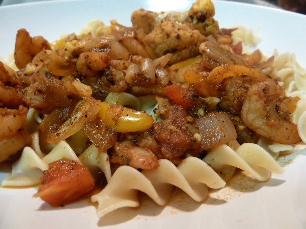 3. Add shrimp into cooked vegetables, turn down heat and mix to coat. Add salt to taste. Cook shrimp JUST until they turn pink and then remove from heat. Do not overcook.